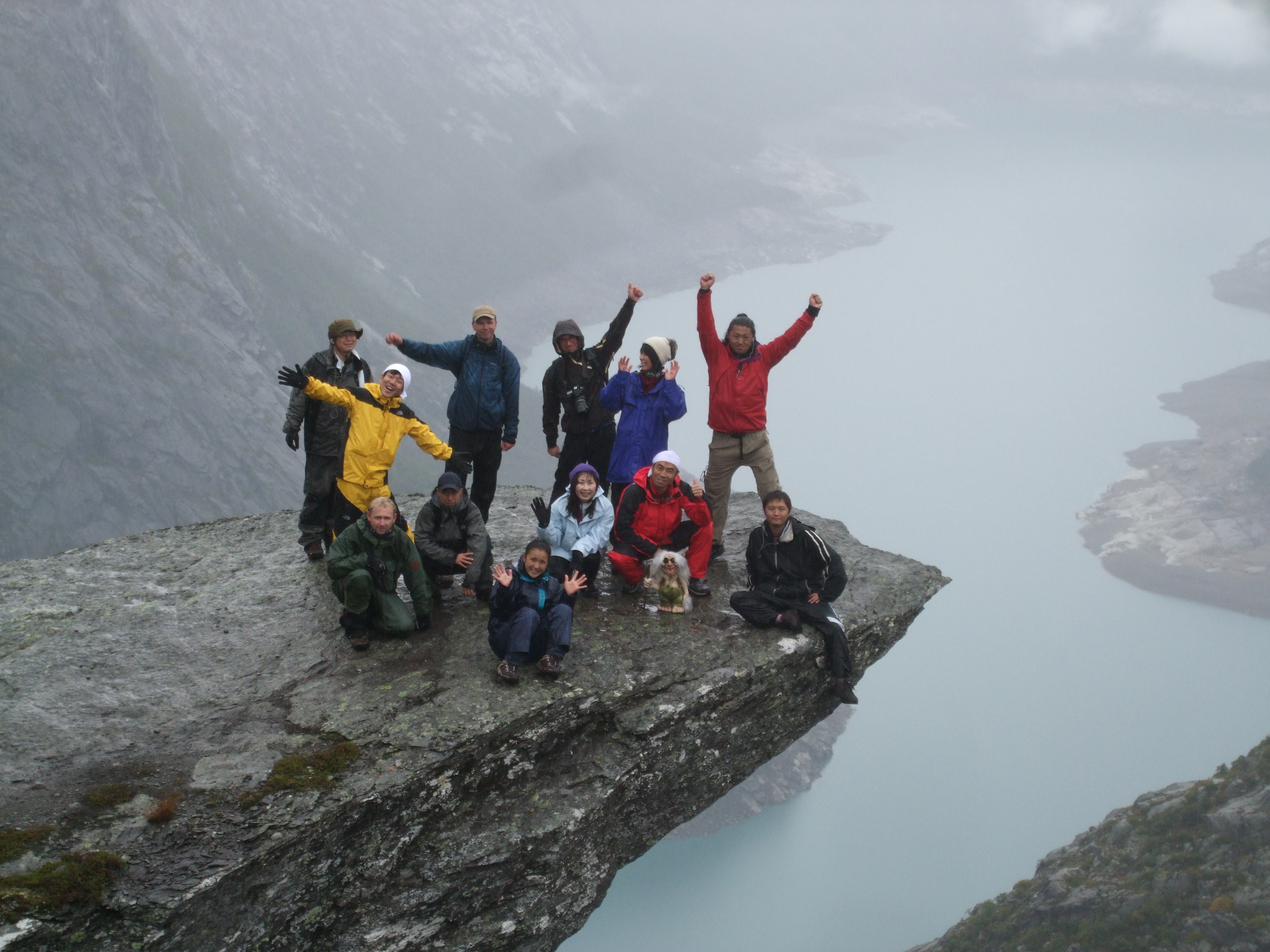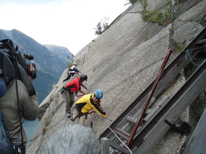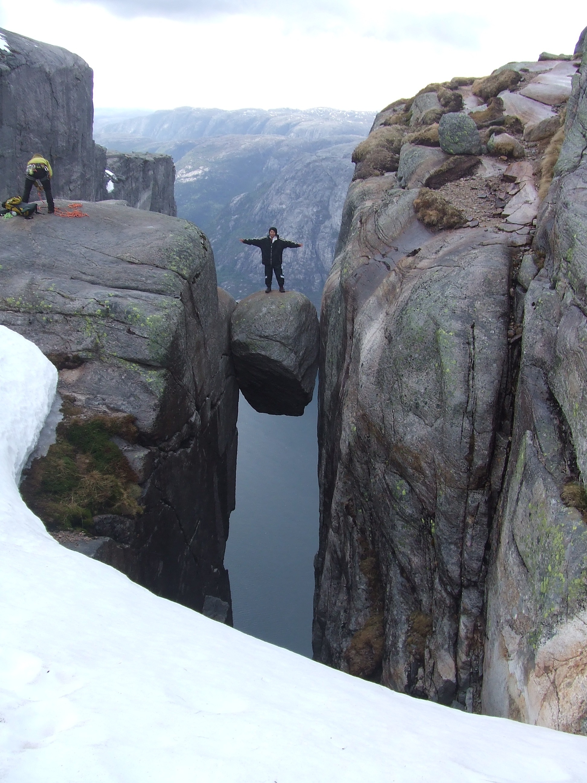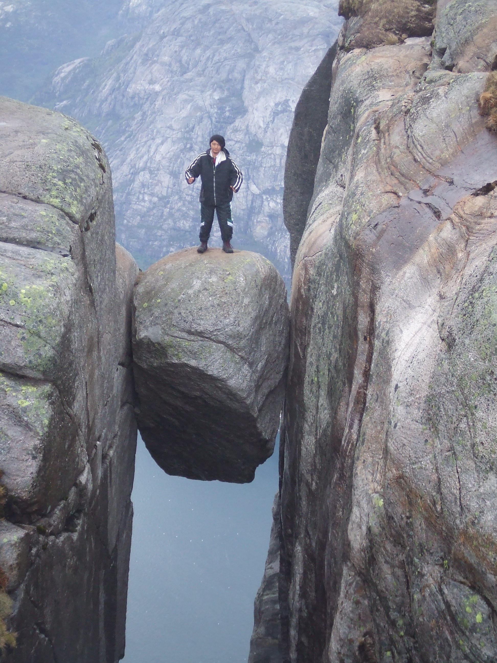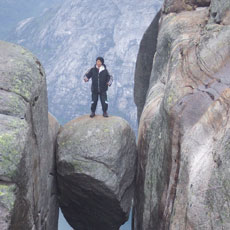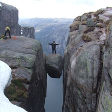■フィヨルドにある地上1000mの岩の上でペナルティのワッキーさんがホッピングに挑戦